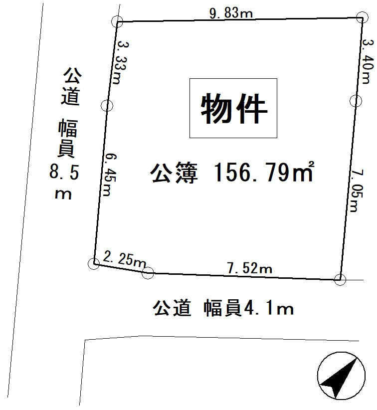 | 接道状況 | 角地 (南西側 公道8.5m 間口9.7m) (南東側 公道4.1m 間口9.7m) | ||